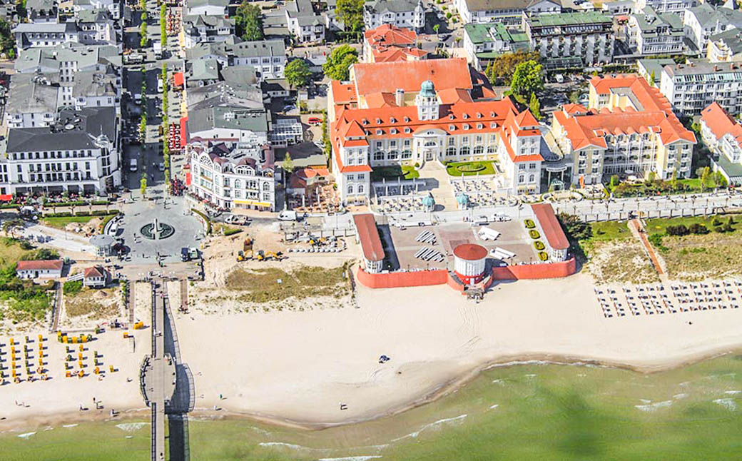 Luftbild vom Ostseebad Binz mit dem Kurhaus und der Seebrücke.