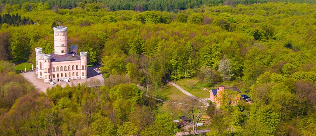 Das Jagdschloss Granitz mit dem Aussichtsturm. Rechts das Informationszentrum des Biosphärenreservats.